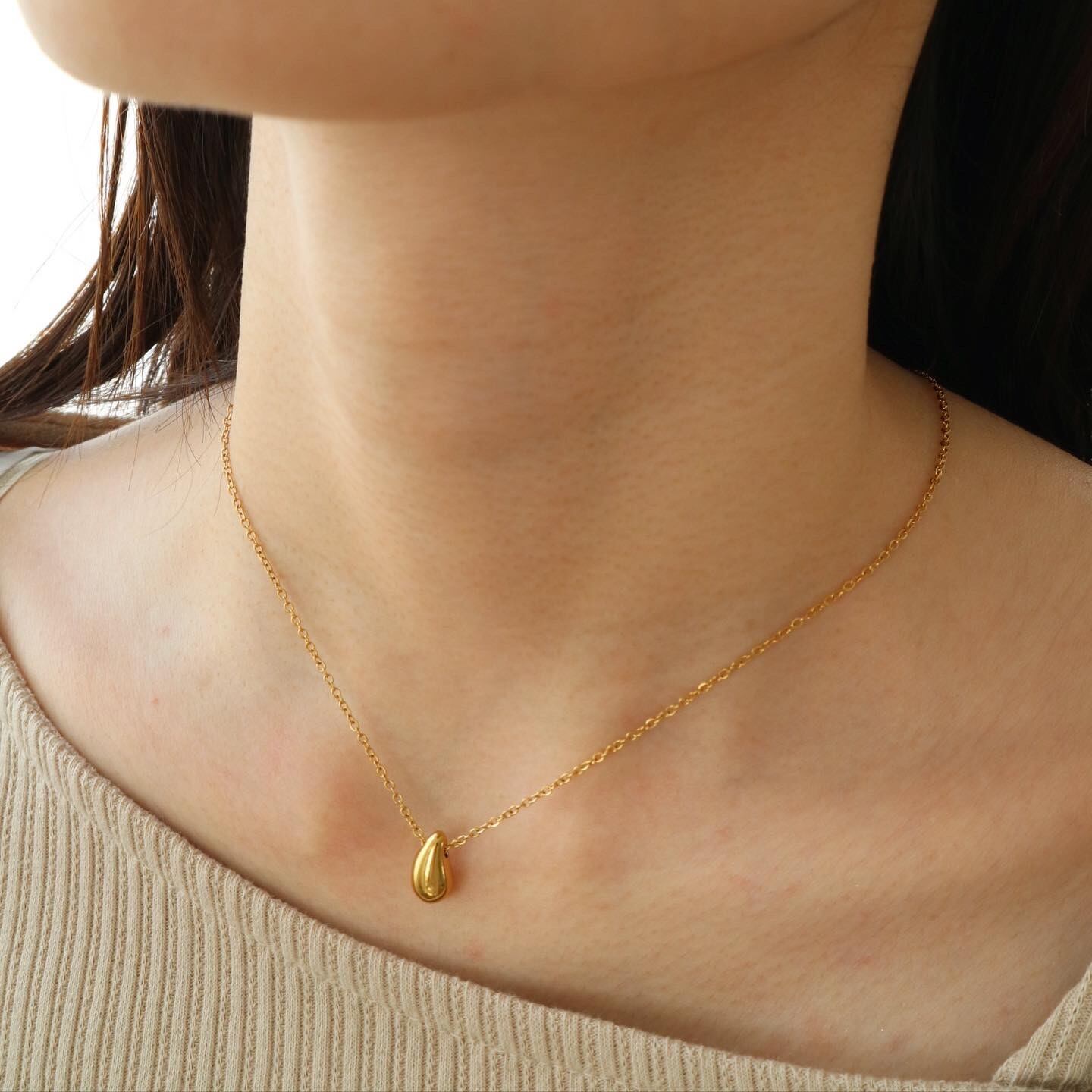 繊細なチェーンと、柔らかな丸みのあるドロップ型のチャームが