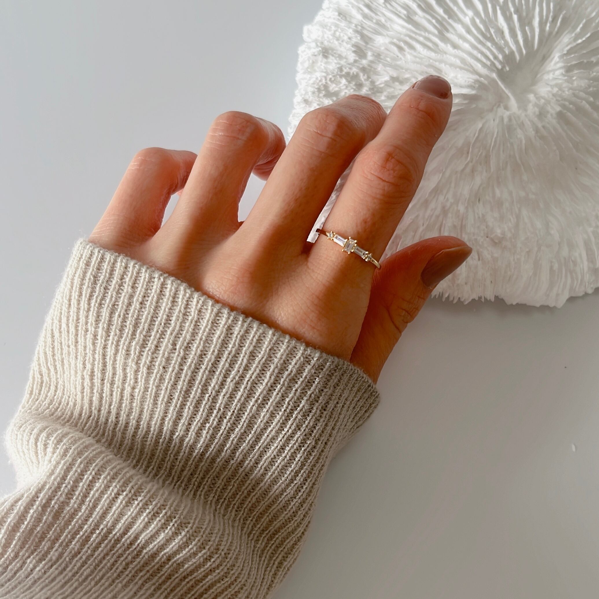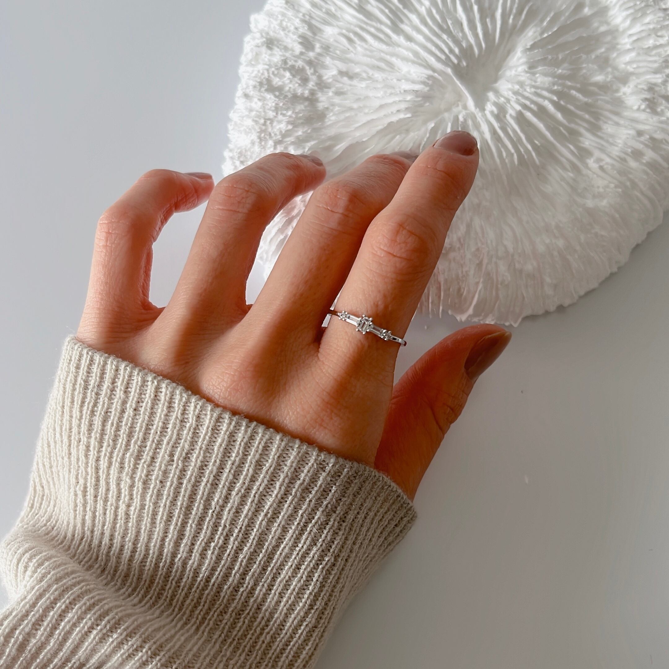 煌めきが美しいスクエア型のジルコニアが特徴的なリングです。